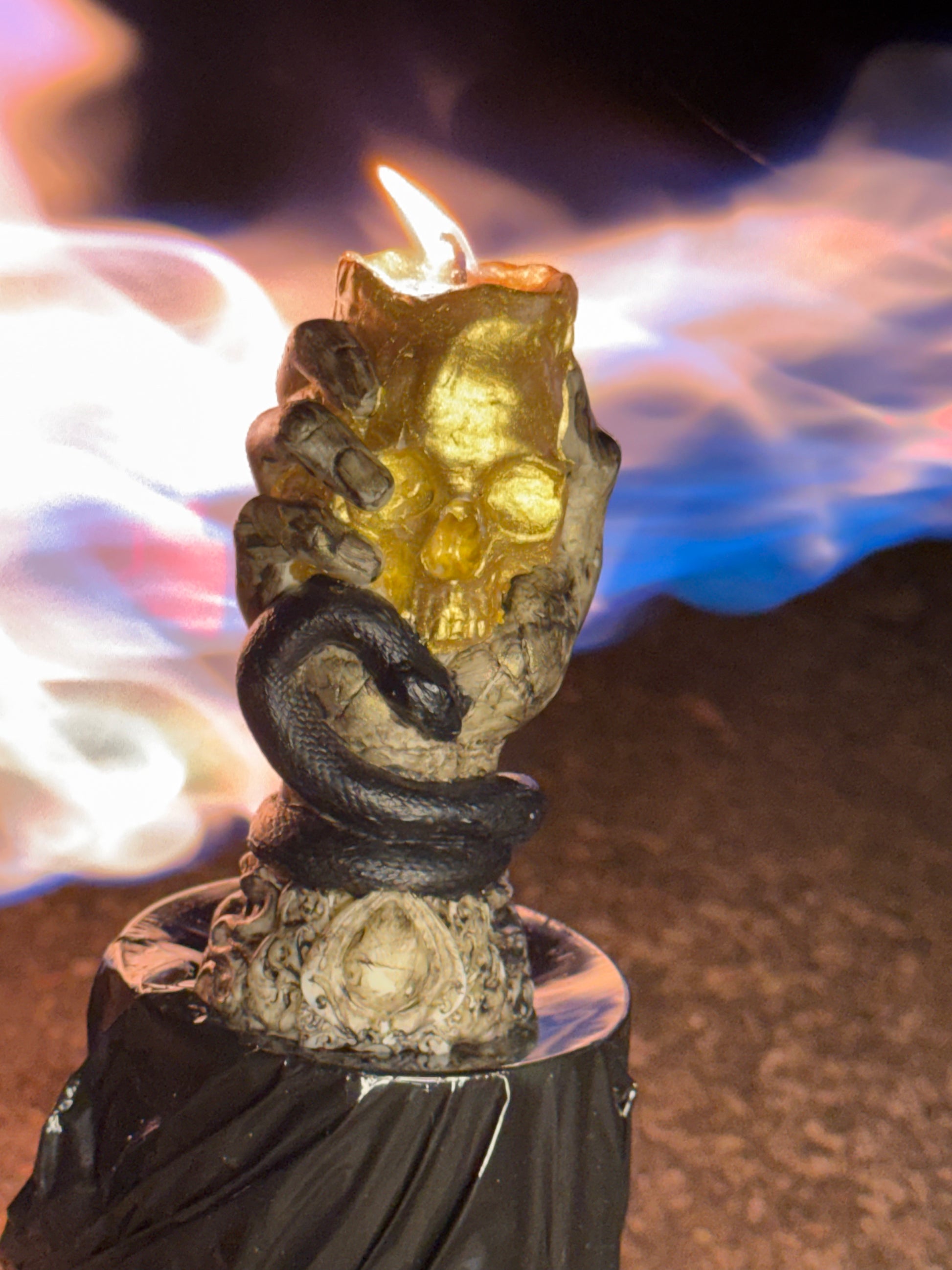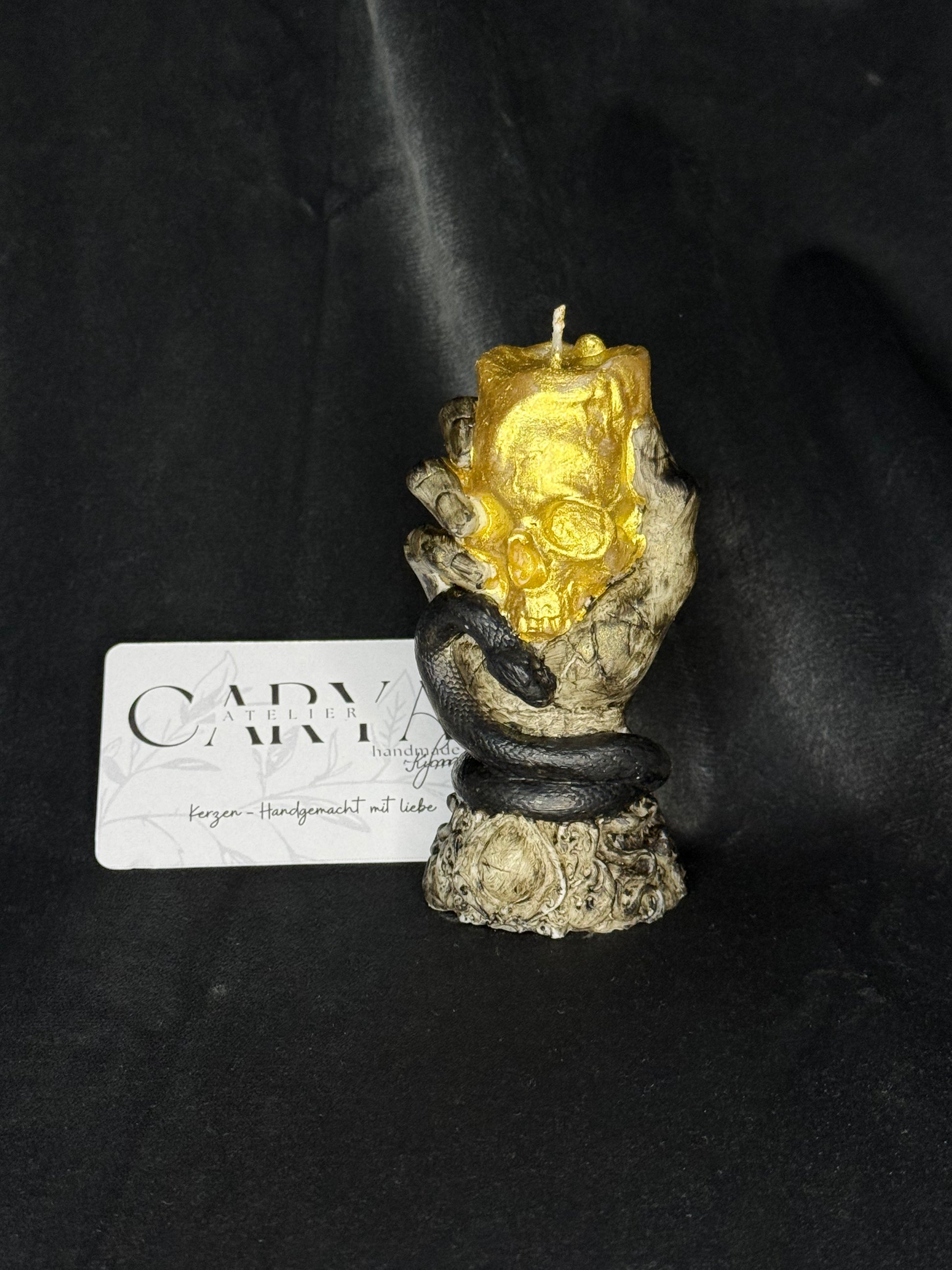 Totenkopf-Schlange-Kerze – Mystisches Design mit Goldakzenten CaryaAtelier.com